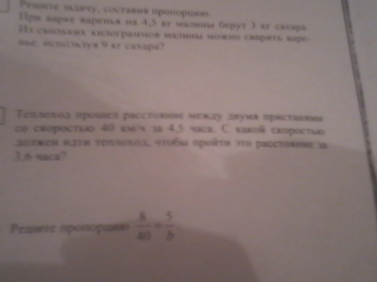 теплоход прошол расстояние между двумя пристанями со скоростью 40 км/ч за 4,5 часа. С какой скоростью должен иди теплоход, чтобы пройди это расстояние за 3,6 часа?