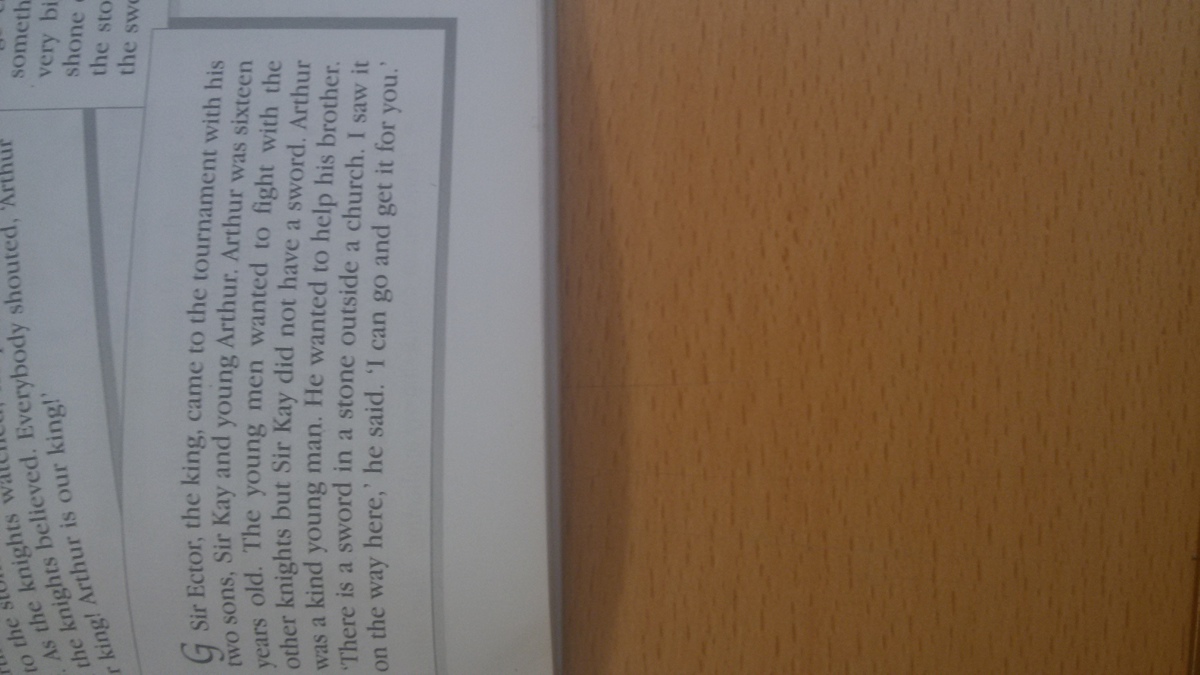 Сэр Ектор, король, пришел на турнир с его двумя сыновьями. Сэр Кай и младший Артур. Артуру было 16 лет. Молодой человек хотел бороться с другими рыцарями, но у Сэра Кая не было меча. Артур был добрым молодым человеком. Он хотел помочь своему брату. "Там есть меч в камне снаружи церкви, я видел его, когда шел сюда",- сказал он," я могу пойти и достать его для тебя".