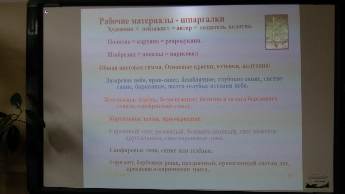 3. Что изображено на картине : а)небо; б)снег; в)березы; г)горизонт.
