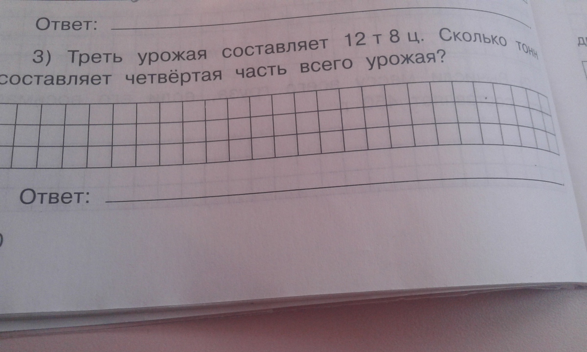 Треть урожая состовляет 12т 8ц . Сколько тонн состовляет четвертая часть всего урожая?
