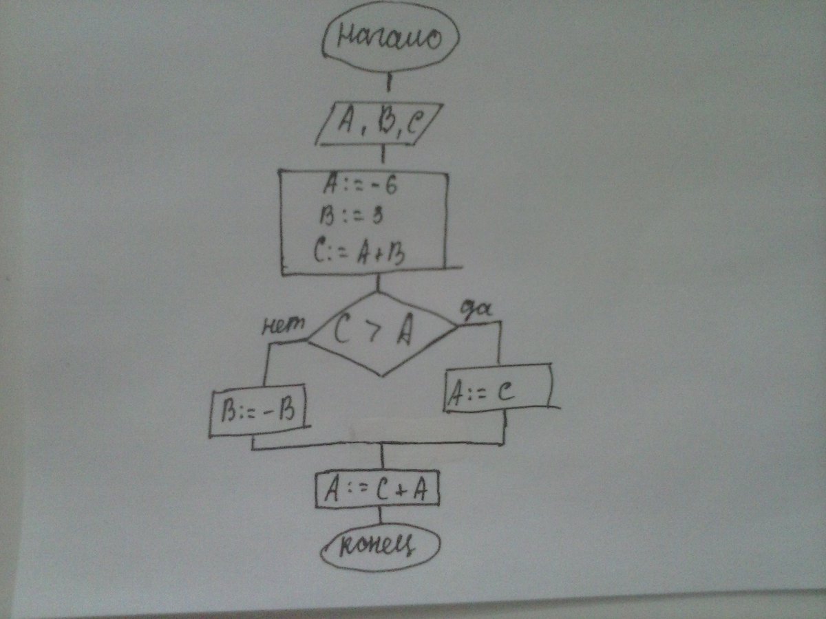 Чему равны конечные значения А и В после выполнения алгоритма при следующих начальных значениях: А=-6, В=3. Нарисуйте блок-схему этого алгоритма.