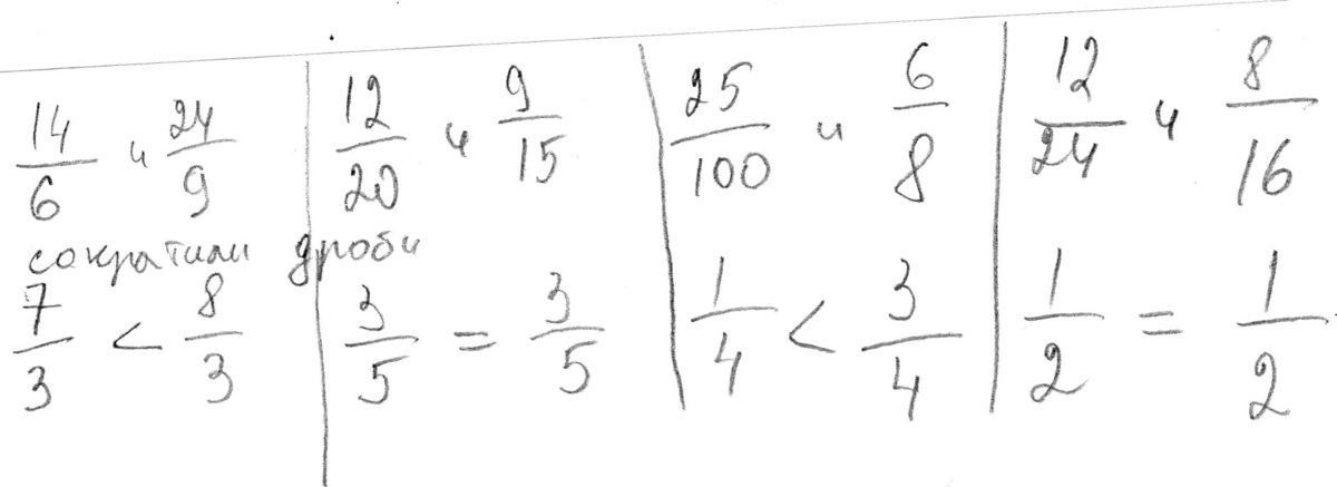 сравните дроби,сократив их;запишите результат с помощью знака >, < или =:а)14/6 и 24/9 б)12/20 и 9/15 в)25/100 и 6/8 г)12/24 и 8/16