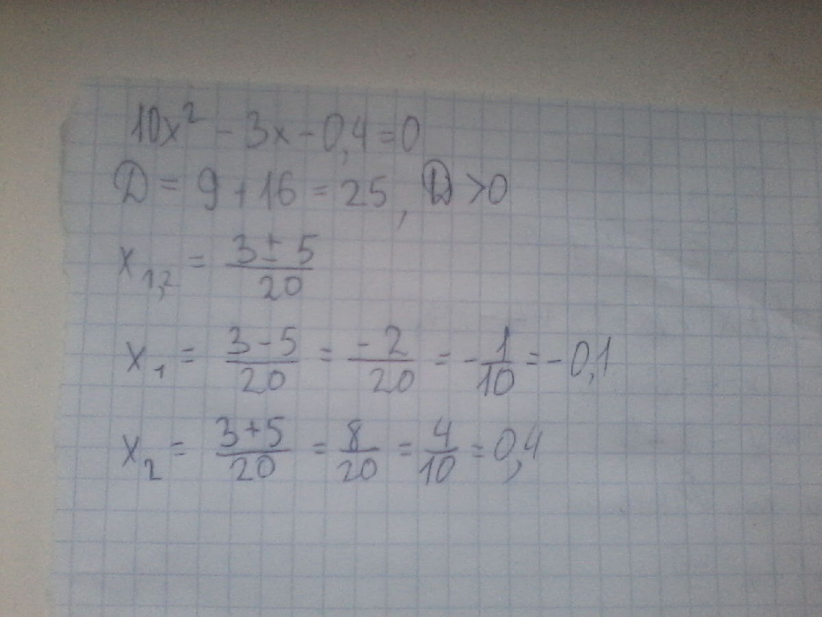 D = под корнем 9 + 4 * 10 * 0.4 = под корнем 9 + 16 = 25 = 5