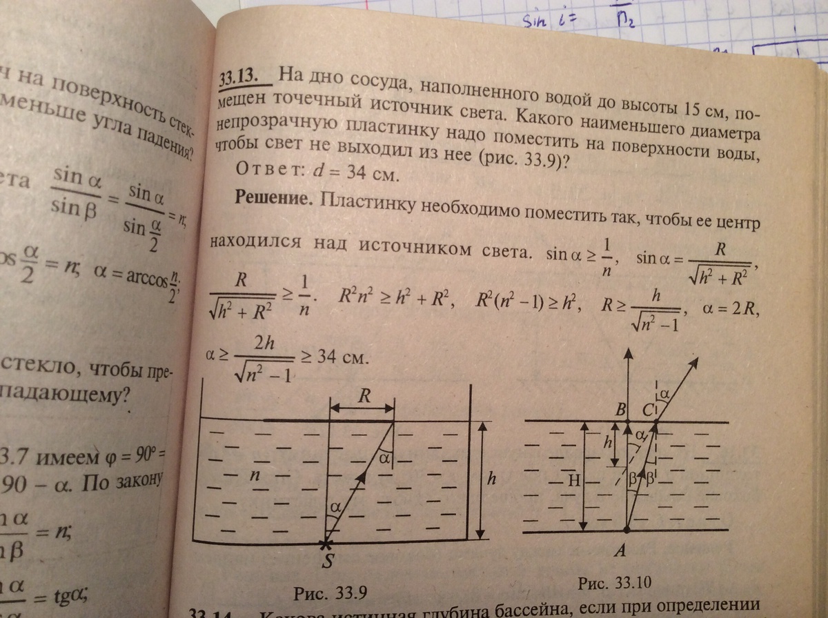 На дно сосуда,наполненного водой помещен точечный источник света.Чтобы свет не выходил из воды над источником помещают круглую непрозрачную пластину.Если сосуд наполнить водой до высоты 15 см,чему равен минимальный диаметр пластины?Ответ выразить в сантиметрах и округлить до целого числа.