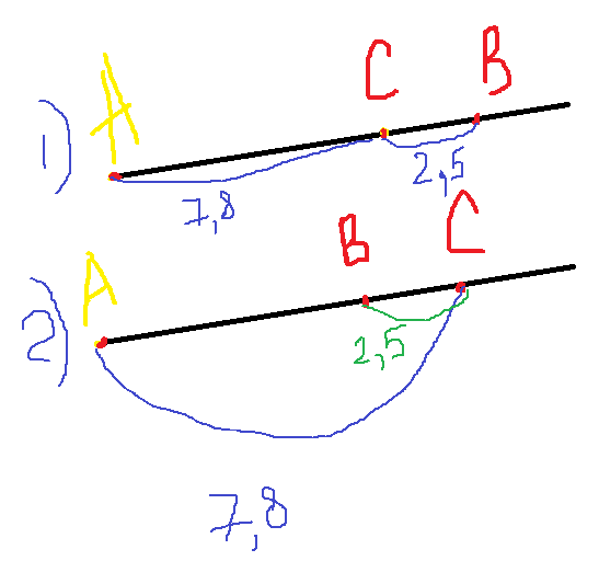 в первом случае точка С лежит ближе к точке А, чем точка В лежит к точке А.в таком случае отрезок АВ равен сумме отрезков АС и СВ, АВ= 7,8+2,5=10.3 см