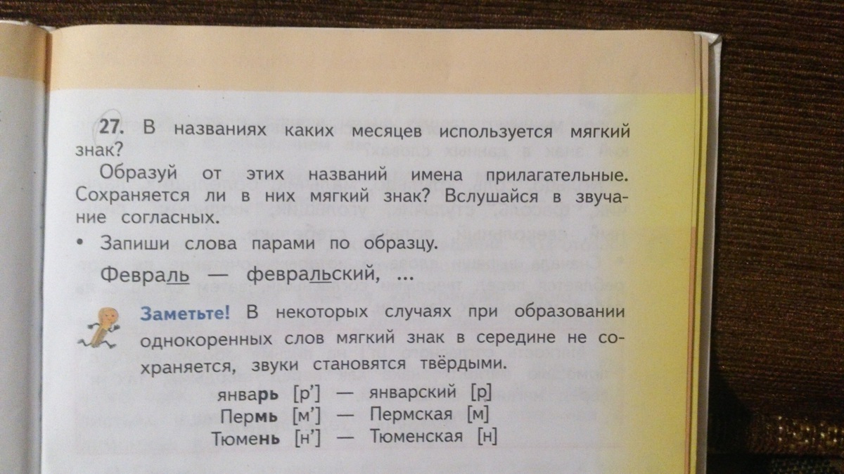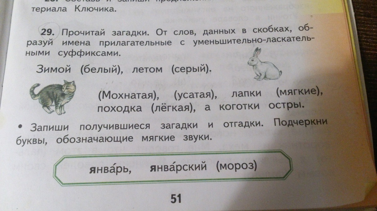 Зимой беленький, летом серенький. Мохнатая, усатая, лапки мягкие, а коготки остры (Кошка). Буквы, обозначающие мягкие звуки - ся,ки, лё. Буквы : и,е,ё,я,ю, - если они стоят за согласными, значит согласная мягкая, кроме Ж, она всегда твердая. № 27. январь - январский, февраль - февральский, март - мартовский, апрель - апрельский, май - майский, июнь-июньский, июль-июльский,август-августовский, сентябрь - сентябрьский, октябрь-октябрьский,ноябрь-ноябрьский, декабрь-декабрьский
