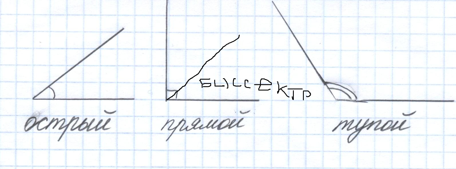 по клеточкам тетради чертятся две линии, одна вертикально, друга - горизонтально, от места их соединения по диагоналям клеточек чертится биссектриса