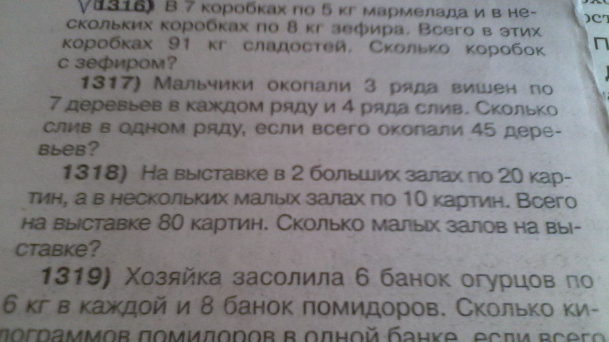 7деревьев в каждом ряду и 4 ряда слив. Сколько слив в одном ряду , если всего окопали 45 деревьев помогите решить номер #1317