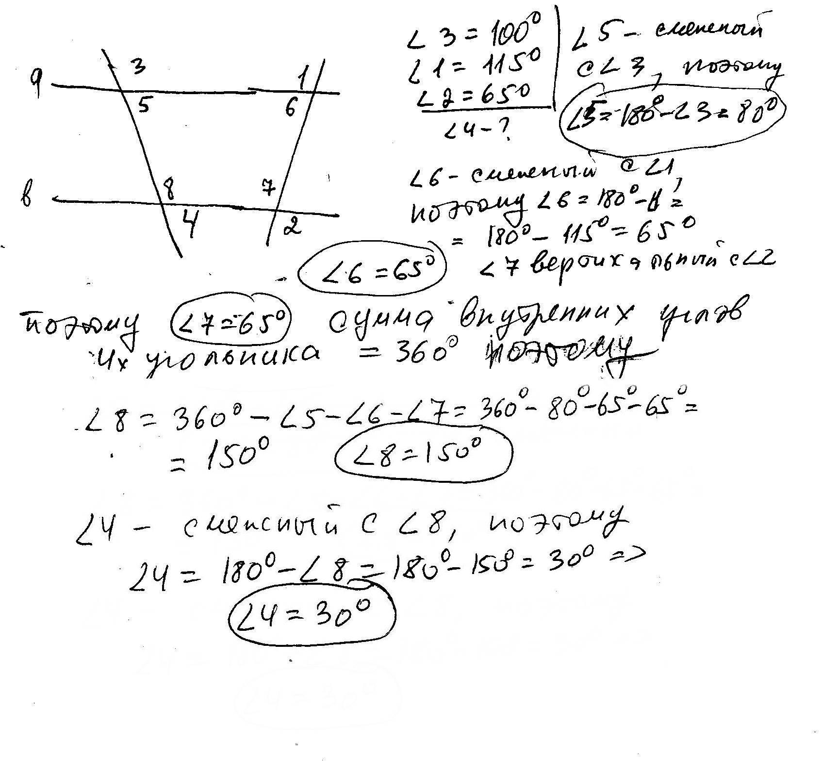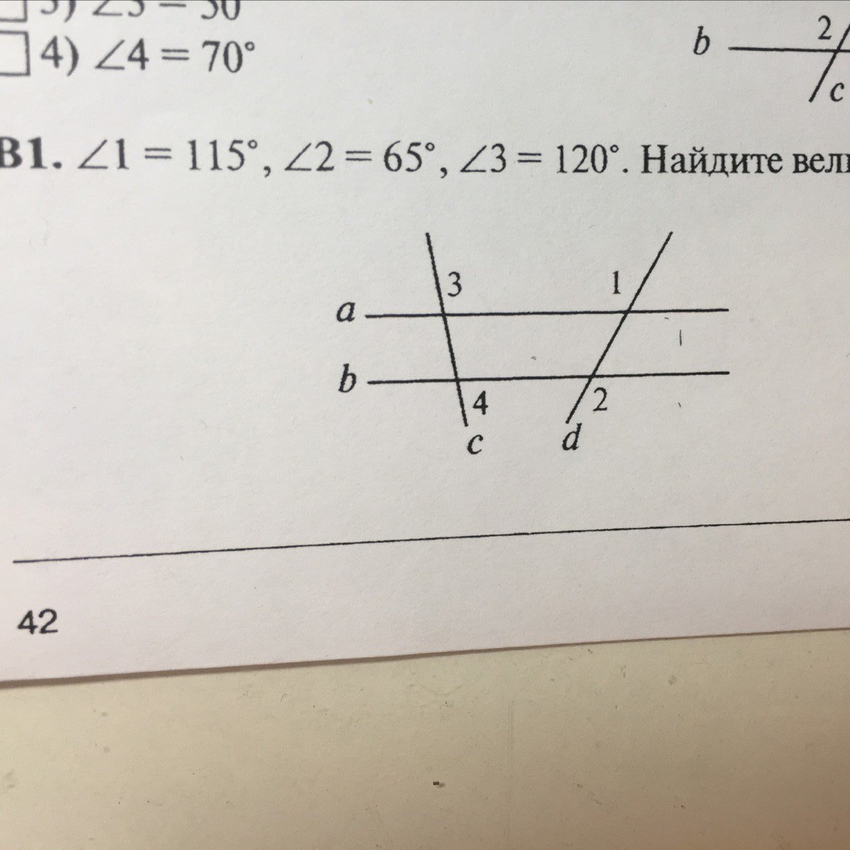 угол 1= 115 градусов, угол 2=65 градусов, угол 3=100 градусов. Найдите величину угла 4