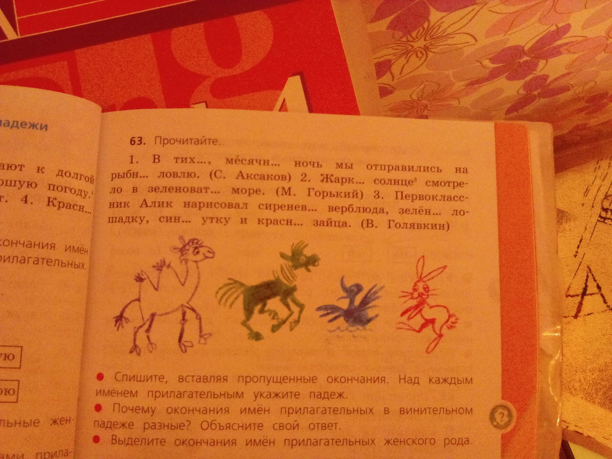 В тихую, месячную ночь мы отправились на рыбную ловлю. (С.Аксаков) 2.Жаркое солнце смотрело в зеленоватое море.(М.Горький) 3.Первоклассник Алик нарисовал сиреневого верблюда, зелёную лошадку, синюю утку и красного зайца. (В.Голявкин).