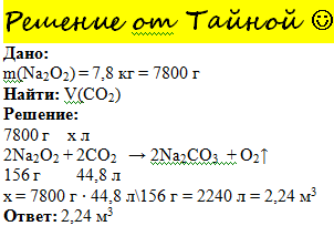 Пероксид натрия используется для регенерации воздуха в подводных лодках. Процесс происходит по схеме Na2O2 + CO2 -> Na2CO3 + O2 . Какой объем углекислого газа можно восстановить пероксидом натрия массой 7.8кг?
