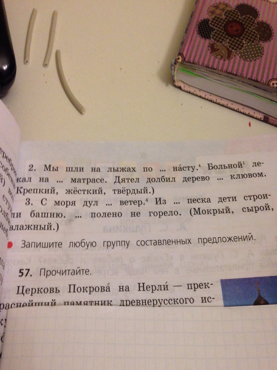 Мы шли на лыжах по жёсткому насту . Больной лежал на твёрдом матрасе .Дятел долбил дерево крепким клювом .