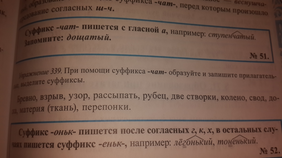 Помогите !!!Упражнение.При помощи суффикса -чат-образуйте и запишите прилагательные виделите суффиксы