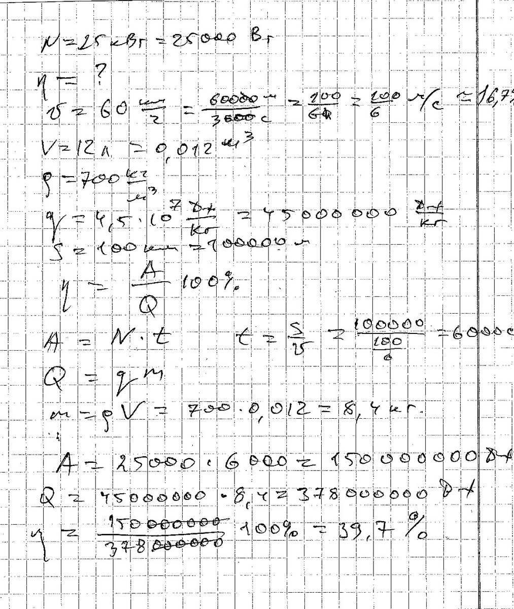 двигатель автомобиля развивает мощность 25кВт определите кпд двигателя если при скорости 60 км/ч он потребляет 12 л бензина на 100км пути плотность бензина 700 кг/м3 при сгорании 1 кг бензина выделяется количество теплоты равное 4,5 * 10 в 7 дж