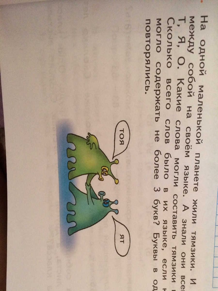 На одной маленькой планете жили тямзики.И говорили они между собой на своем языке.А знали они всего три буквы:Т,Я,О.Какие слова могли составить тямзики из этих букв?Сколько всего слов было в их языке,если каждое слово могло содержать не более 3 букв?Буквы в одном слове не повторялись.
