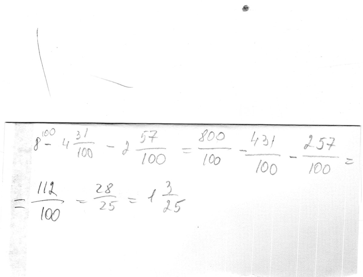 8 - 4 31/100 -2 57/100 = 8 - (4 31/100 +2 57/100) = 8 - 6 (31+57)/100 =