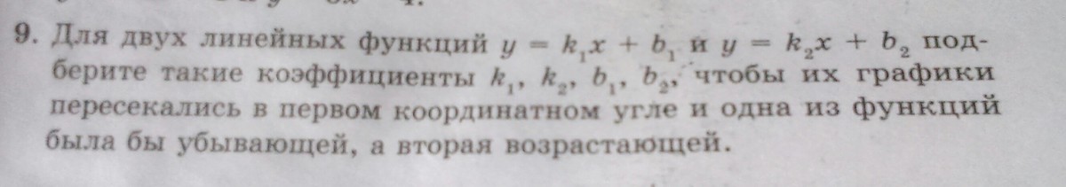 Для двух линейных функций y=k1x+b1 и y=k2x+b2 подберите такие коэффициенты k1,k2,b1,b2, чтобы их графики пересекались в первом координатном угле и одна
