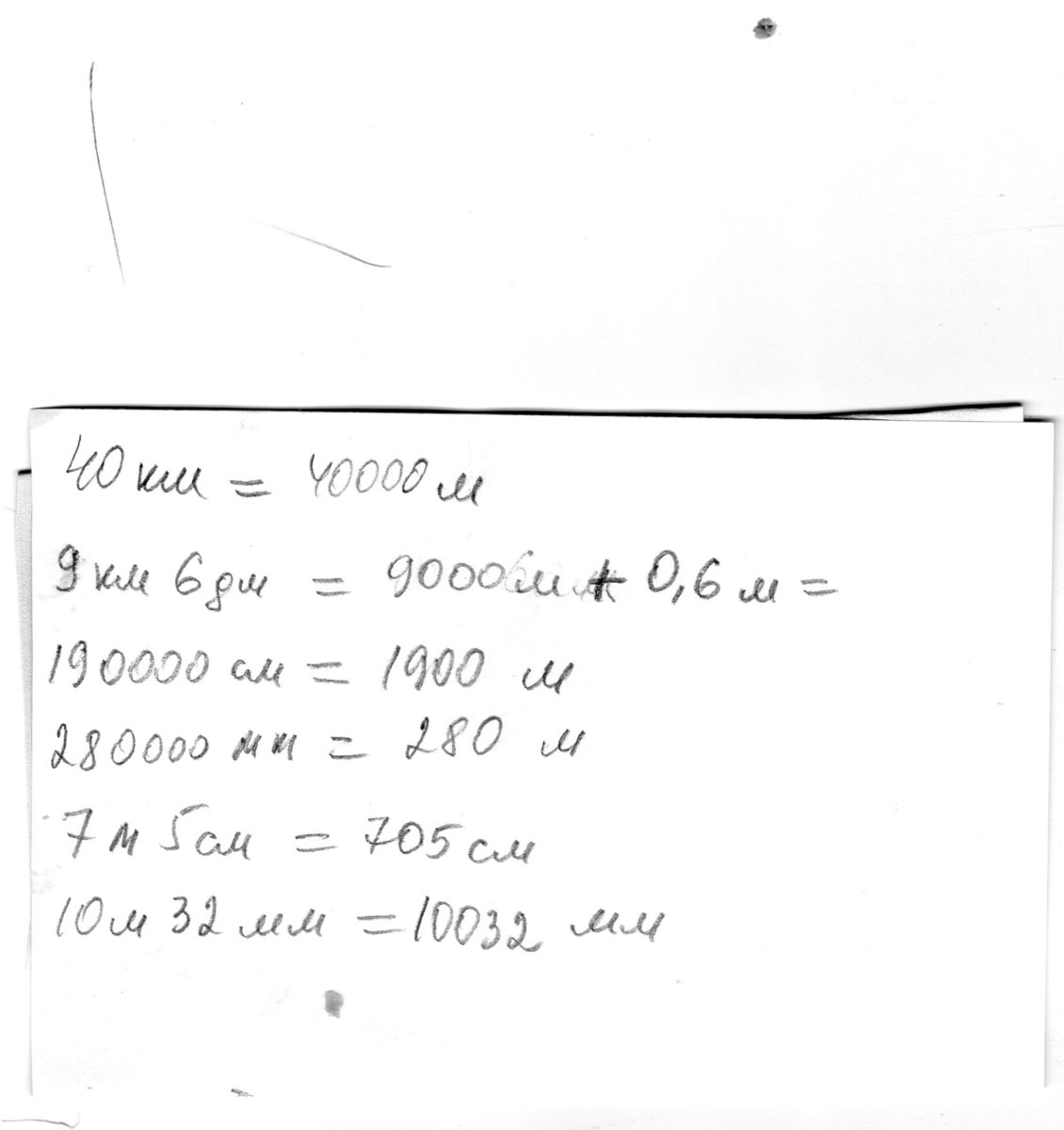 40км=40000м, 9км 6 дм=900060см, 190000см = 1900м, 280000мм=280м., 7м 5 см=705см, 10м 32мм= 10032мм