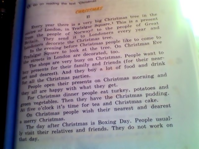 Утром, перед Рождеством, люди любят приходить на Трафальгарскую площадь, чтобы посмотреть на дерево( скорее всего елку). На Рождественское утро улицы в Лондоне тоже украшены.