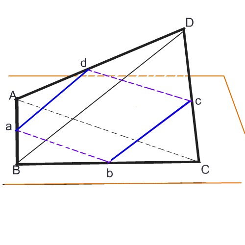 Каждый отрезок, соединяющий середины сторон четырехугольника, является срединной линией треугольника, образованного двумя сторонами пространственного четырехкольника и диагональю. Причем противоположные отрезки равны и параллельны, так как параллельны третьей стороне ( диагонали) и равны ее половине.