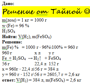 На 1кг лома, содержащего 96% железа, подействовали серной кислотой. Вычислите массу образовавшегося сульфата железа и объем выделившегося газа.