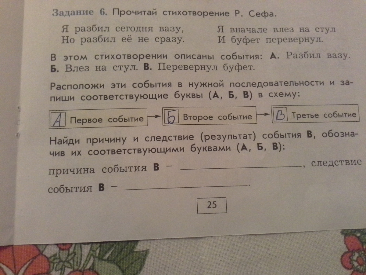 В задании "расположи эти события в нужной последовательности..." допущена ошибка. Правильный порядок - Б-В-А (влез на стул-перевернул буфет-разбил вазу)