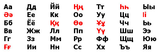 Аа Ә ә Бб Вв Гг Ғ ғ Дд Ее Ёё Жж Зз Ии Йй Кк Қ қ Лл Мм Нн Ң ң Оо