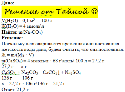 Какую массу карбоната натрия надо прибавить к 0,1 м3 воды, чтобы устранить жесткость, равную 4 ммоль/л? Составьте уравнения соответствующих реакций.