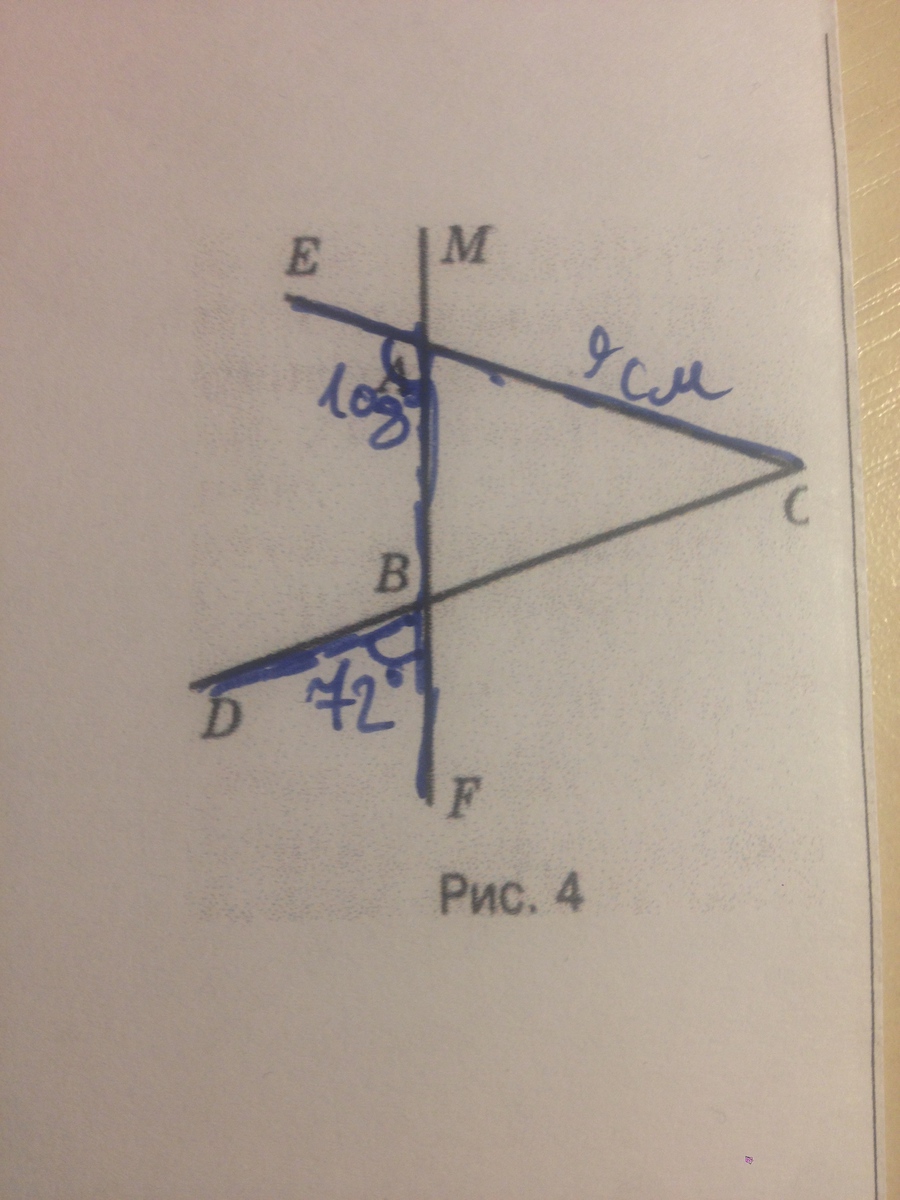 На рисунке 4,угол BAE=108',угол DBF=72',AC=9 см.Найдите CB треугольника ABC.