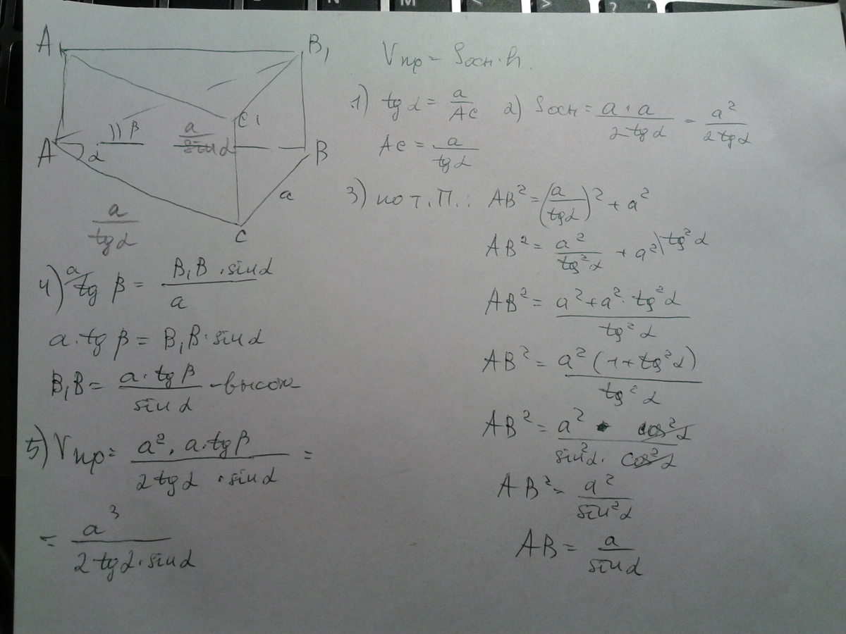 В основании прямой призмы лежит прямоугольный треугольник с катетом a и противолежащим ему углом α. Диагональ большей боковой грани составляет с плоскостью основания угол β. Найдите объём призмы.