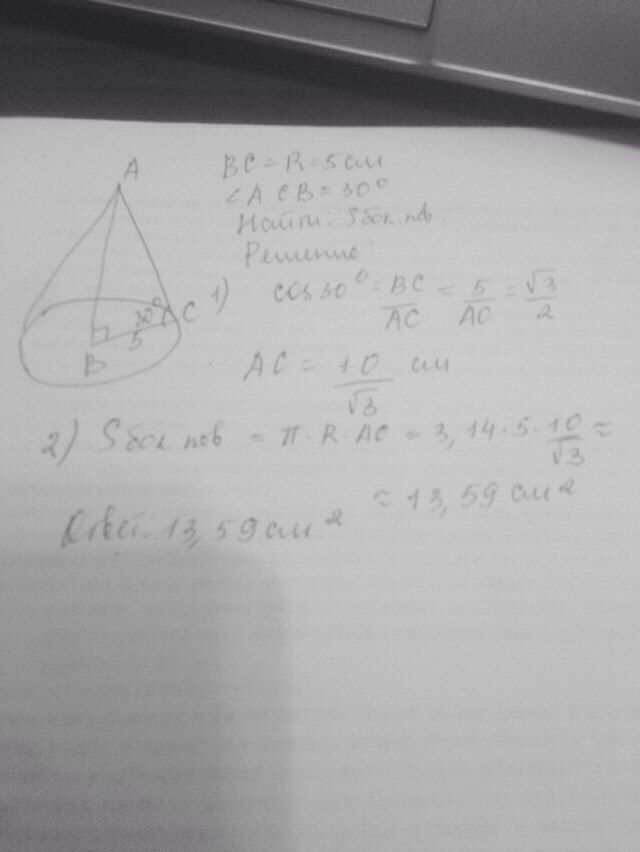 конус ,радиус основания 5см образующая наклонена к плоскости основания под углом 30градусов найти площадь боковой поверхности