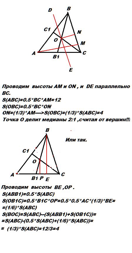 Площадь треугольника АВС равна 12см2.Медианы ВВ1 и СС1 этого треугольника пересекаются в точке О.Найдите площадь треугольника ОВС