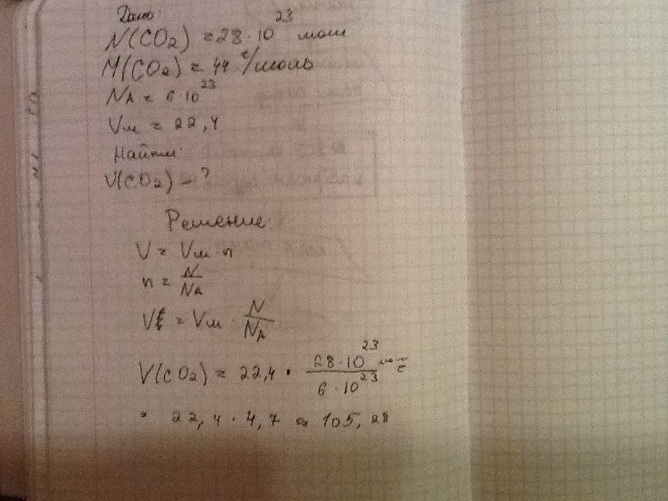 найти объем углекислого газа если число молекул равно 28*10 в 23 степени молекул . помогите решить