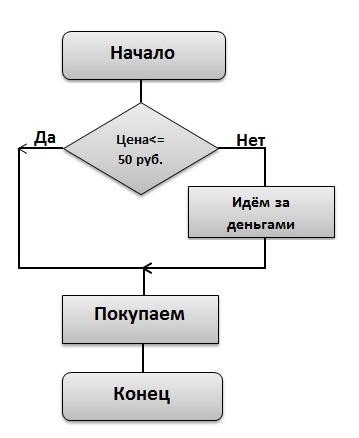 Если шоколад стоит не больше 50-ти рублей, то купить его, иначе (если больше 50-ти рублей) вернуться домой и взять недостающую сумму. Составить блок- схему.
