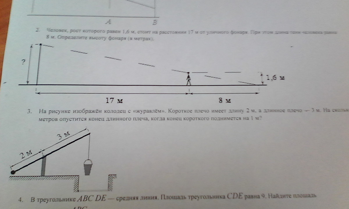 Человек, рост которого равен 1,6 м. стоит на расстоянии 17 м от уличного фонаря. При этом длина тени человек равна 8м. Определите высоту фонаря (в метрах).