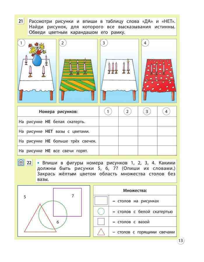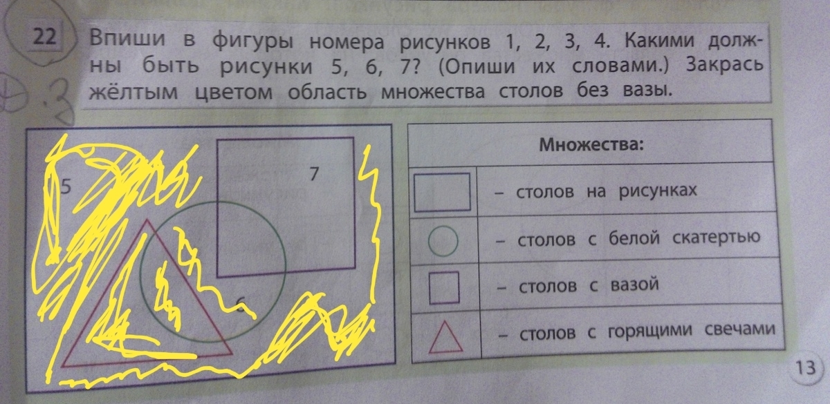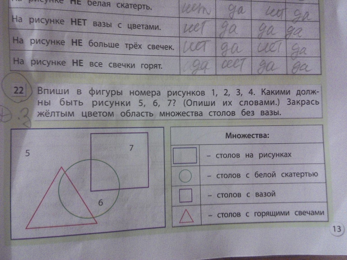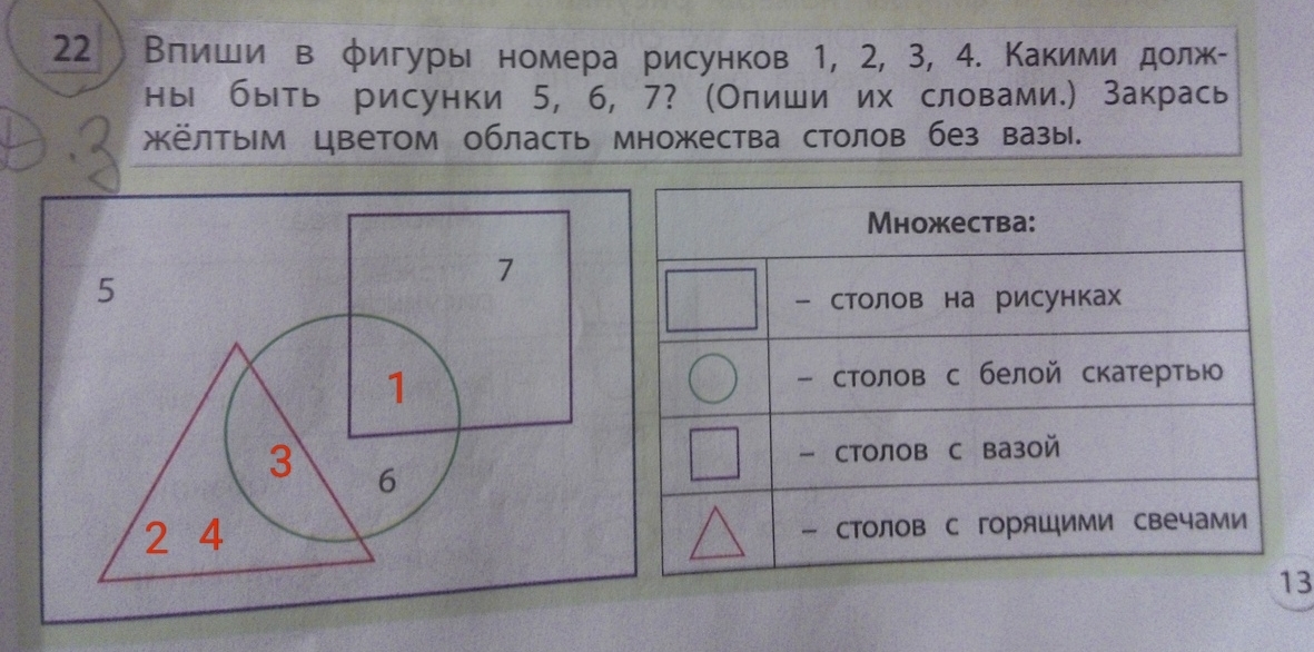 Впиши в фигуры номера рисунков 1,2,3,4. Какими должны быть рисунки 5,6,7? (Опиши их словами). Закрась желтым цветом область множества столов без вазы.
