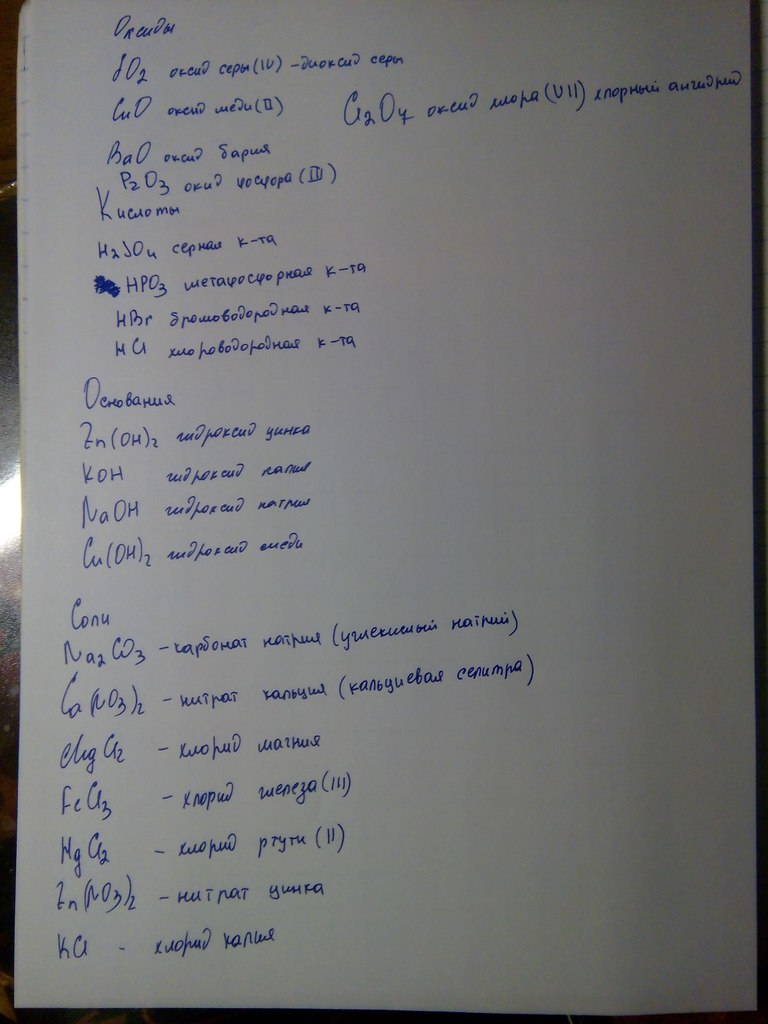 выпишите отдельно в столбики формулы оксидов , кислот , оснований , солей. Дайте название каждому веществу.