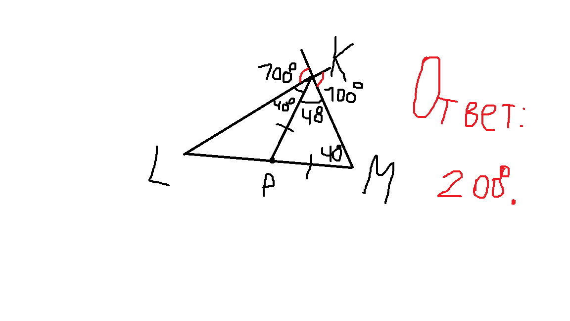 В треугольнике LKM точка P лежит на стороне LM, причем KP=PM, угол М=40 градусам. Найдите сумму внешних углов при вершине К, если КР -биссектриса угла LKM.