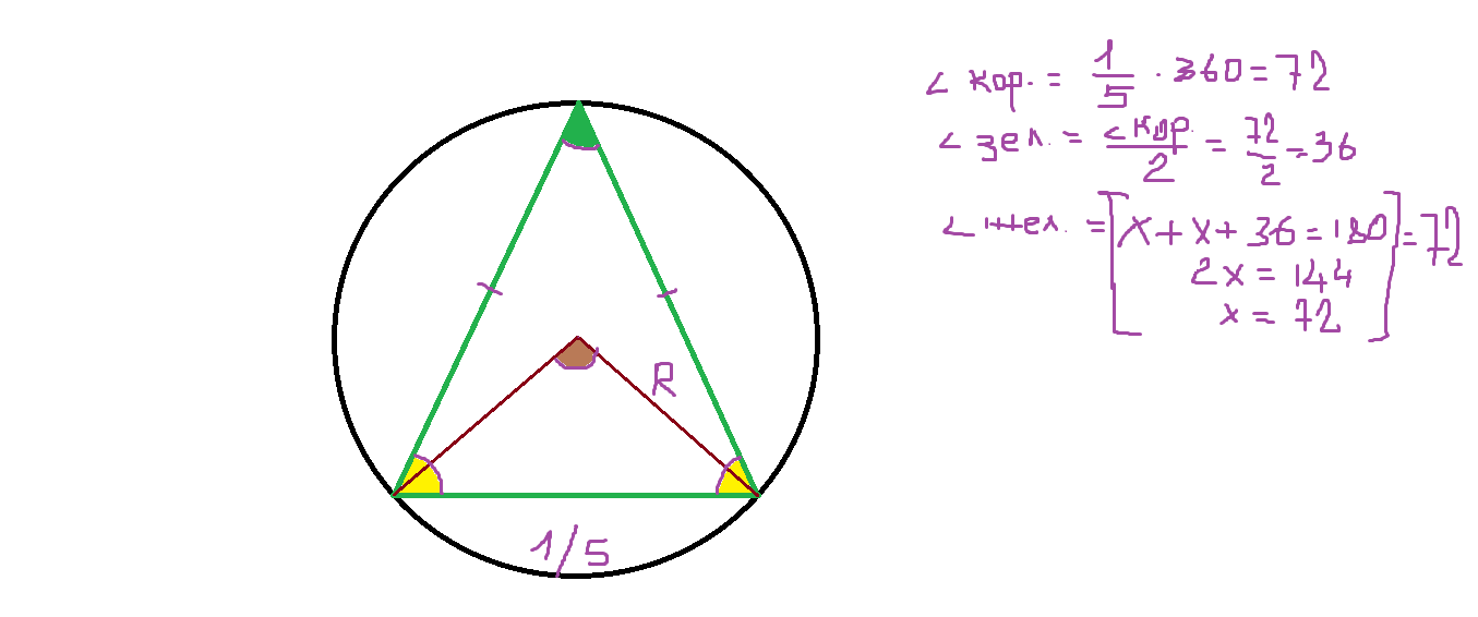 Найдите углы равнобедренного треугольника, основа которого стягивает пятую часть дуги описанной окружности. Рассмотрите все возможные случаи.