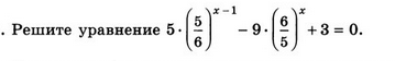 5*(frac{5}{6})^{x-1}-9*frac{6}{5}^x+3=0\6*frac{5}{6}^x-9*frac{6}{5}^x+3=0;frac{5}{6}^x=a;a>0\6a-frac{9}{a}+3=0|*frac{a}{3}\2a^2-3+a=0\2a^2+a-3=0\a_{1,2}=frac{-1^+_-5}{4}\a_1=-frac{3}{2};  a_2=1\.            frac{5}{6}^x=1\.             x=0