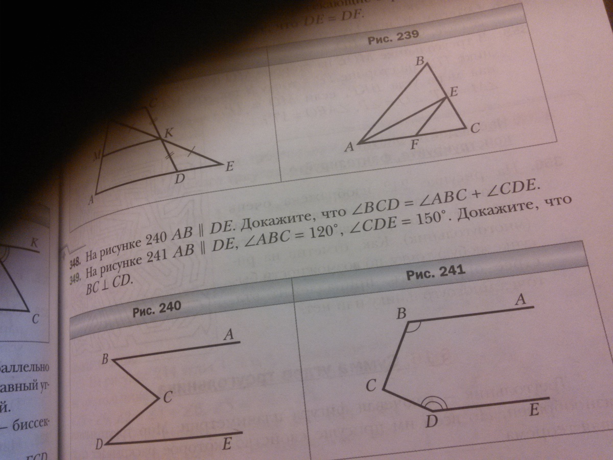 Дочертим отрезки DL и BH, т. к. АВ II DE, то угол CDE равен углу CLB при секущей DL, а также угол DHB равен углу HBL при секущей BH. Т. к. угол DCB смежен с углом BCL, то угол BCL=180 гр. - угол DCB. Сумма всех углов треугольника равна 180-ти градусам значит сумма градусных мер углов треугольника CBL равна угол CBA + угол BLC (=углу CDE) + 180гр. - угол DCB = 180 гр. Перенесем 180 градусов влево и получим: CBA + CDE - BCD = 0 гр., значит BCD = CBA+ CDE.