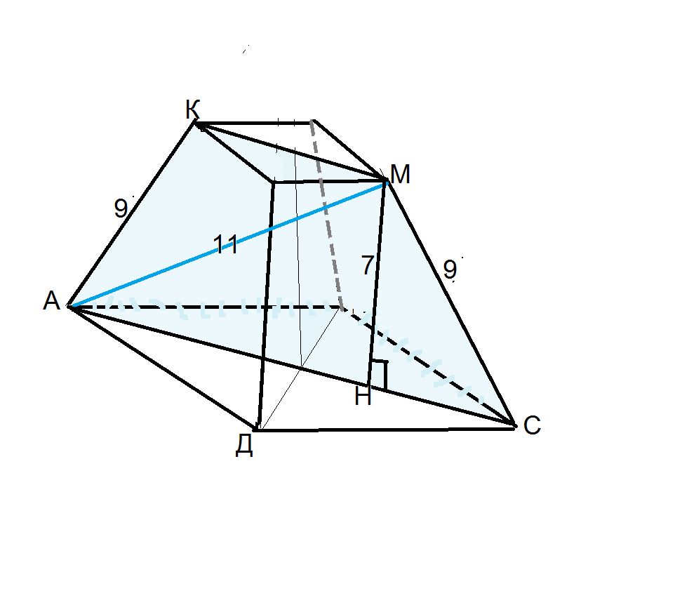 Проведем диагонали оснований АС и КМ в той же плоскости, в которой проведена диагональ усеченной пирамиды.