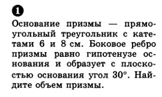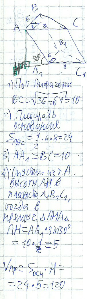 Основание призмы - прямоугольный треугольник с катетами 6 и 8 см. Боковое ребро призмы равно гипотенузе основания и образует с плоскостью основания угол 30 градусов. Найдите объем призмы