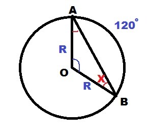 Дуга окружности равна 120 градусов. Вычислите угол между хордой дуги и радиусом, проведённым в конец хорды.