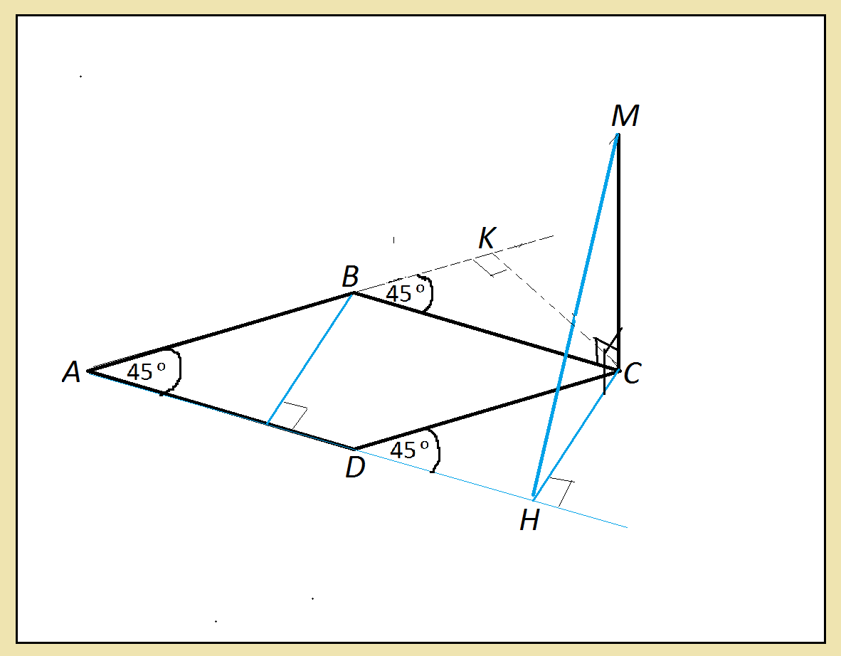 К плоскости ромба ABCD, в котором угол А=45, AB=8 см, проведен перпендикуляр МС длиной 7 см. Найдите расстояние от точки М до прямых, содержащих стороны ромба.