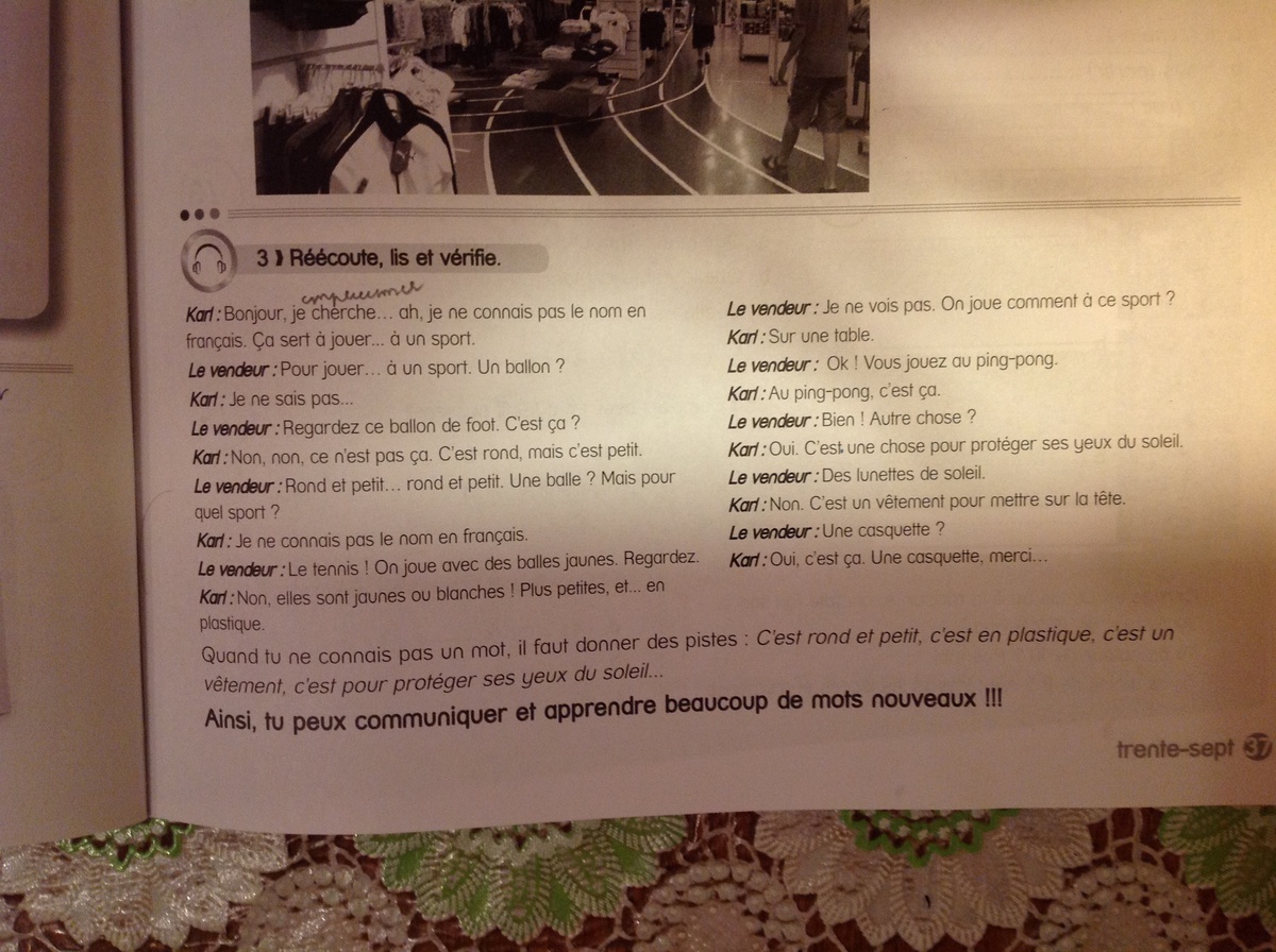 Продавец: Посмотри на футбольный мяч. Это? Карт: Нет, нет. Не это. Оно круглое, но маленькое Продавец: Круглое и маленькое? Мячик? Но для какого вида спорта? Карт: Я не знаю как это будет на французском Продавец: Теннис! В него играют маленьким желтым мячом. Посмотри Карт: Нет. Они желтые и белые. Еще меньше. И пластиковые Продавец: Я не вижу. Как играют в этот вид спорта? Карт: На столе Продавец: Ок. Вы играете в пинг-понг Карт: Ах, да. Пинг-понг! Это именно то Продавец: Хорошо, что-то еще? Карт: Да. Это кое-что для защиты глаз от солнца Продавец: Солнечные очки Карт: Нет. Эта вещь одевается на голову Продавец: Бейсболка? Карт: Да. Именно. Бейсболка. спасибо