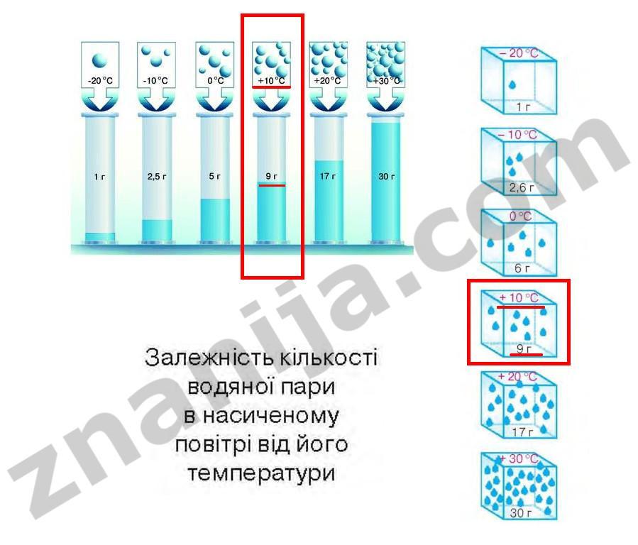 Звідки я знаю, що при температурі +10°С повітря може увібрати близько 9 г води? - З таблиці залежності кількості водяної пари в насиченому повітрі від його температури. Їх як можна знайти окремо, так, зазвичай, у підручниках до розділу щодо вологості повітря зазвичай надається така інформація у вигляді таблиці або ілюстрацій.