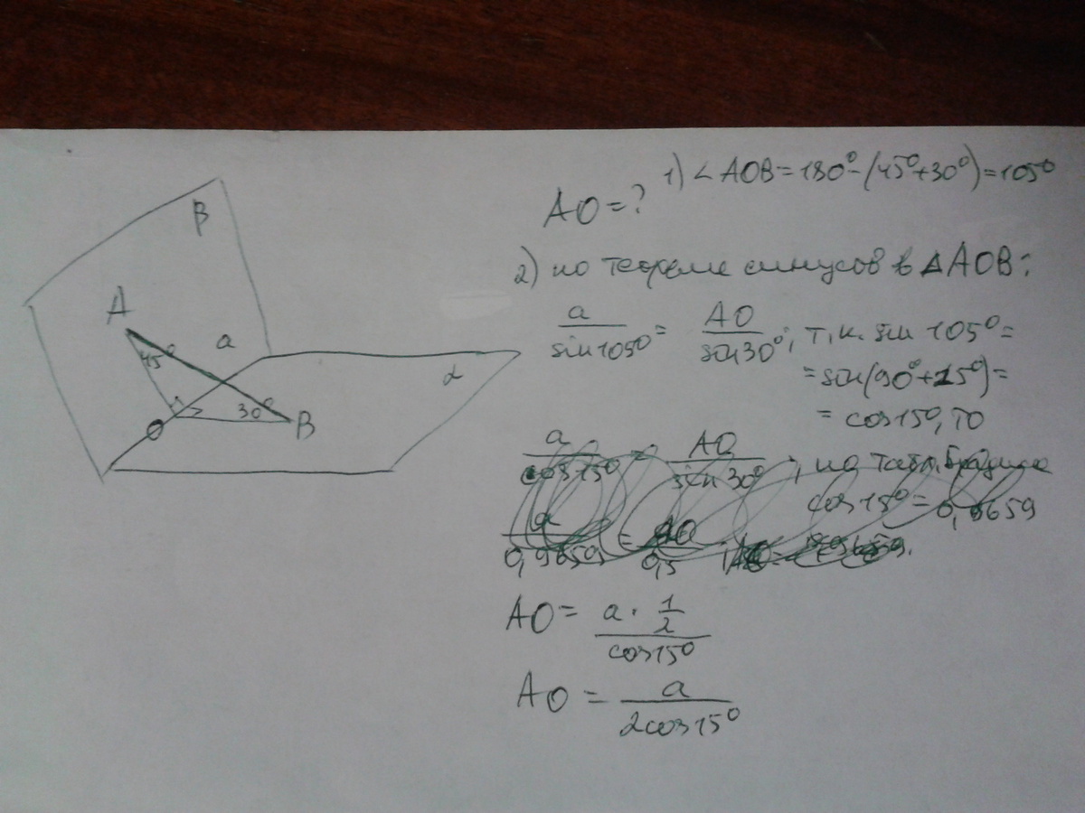 Помогите пожалуйста. Концы отрезка принадлежат двум перпендикулярным плоскостям. И с одной из плоскостей этот отрезок составляет угол 45°, а с другой плоскостью угол 30°. Длина этого отрезка равна а. Найдите длину отрезка, заключённого между перпендикулярами, опущенными на прямую пересечения плоскостей из концов данного отрезка.