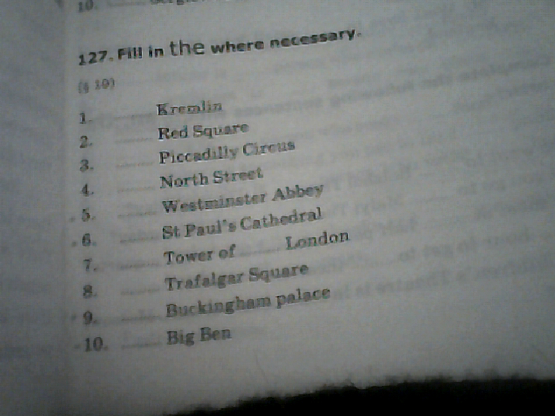 the Kremlin, the Red square, Picadilly Circus, North street, Westminster Abbey, St.Paul's Cathedral, the tower of London, Trafalgar square, Buckingham palace, Big Ben