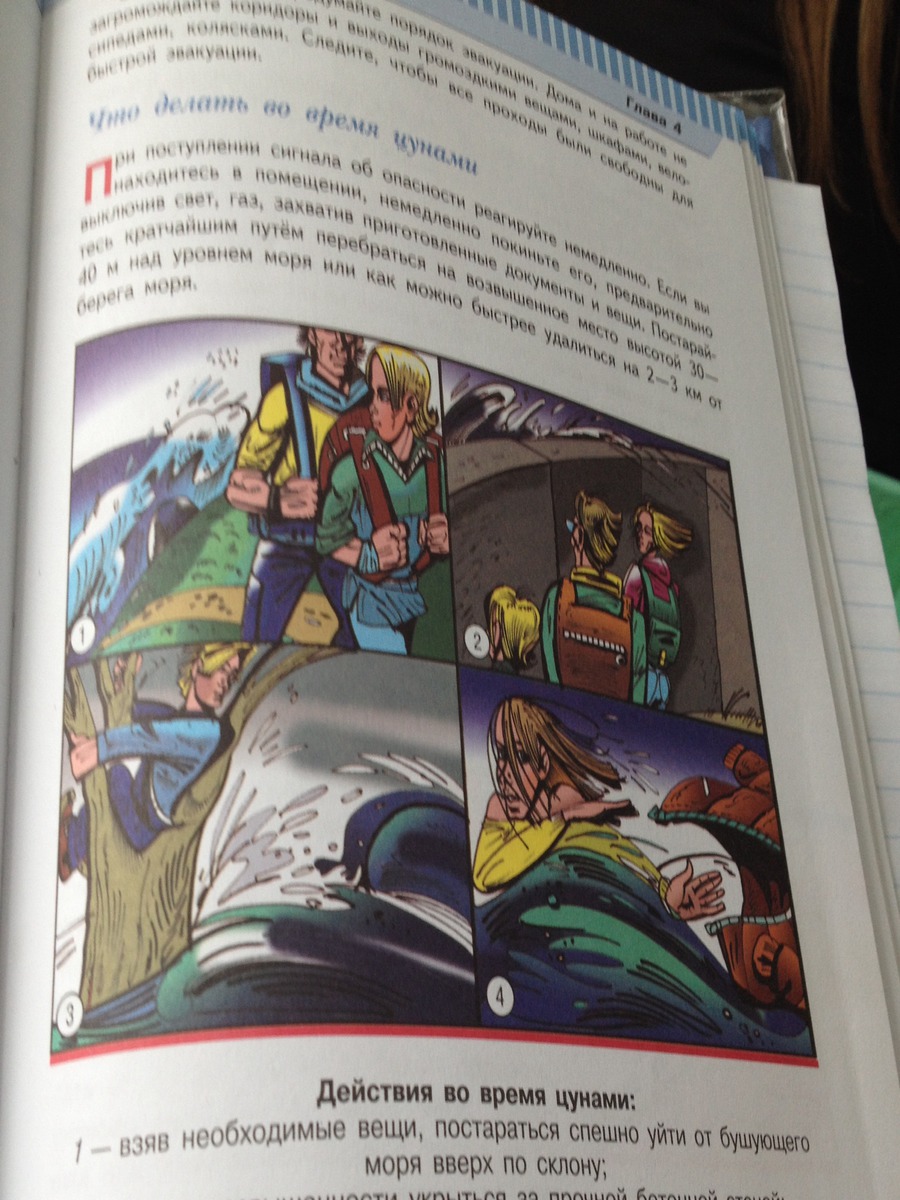 Туристы увидели приближение цунами,начали спешно собирать вещи и поднялись на высокий берег. Опасаясь, они стали укрываться за береговыми дамбами, но волна настигла их. Мужчина постарался зацепиться за большое дерево, чтобы его не унёс обратный поток воды в море. Молодая девушка оказалась в воде. Она успела вовремя снять намокшую куртку.